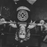 バーベルを逆手で握り、手幅は肩幅より少し狭い〜肩幅よりも10㎝ほど広く握る。